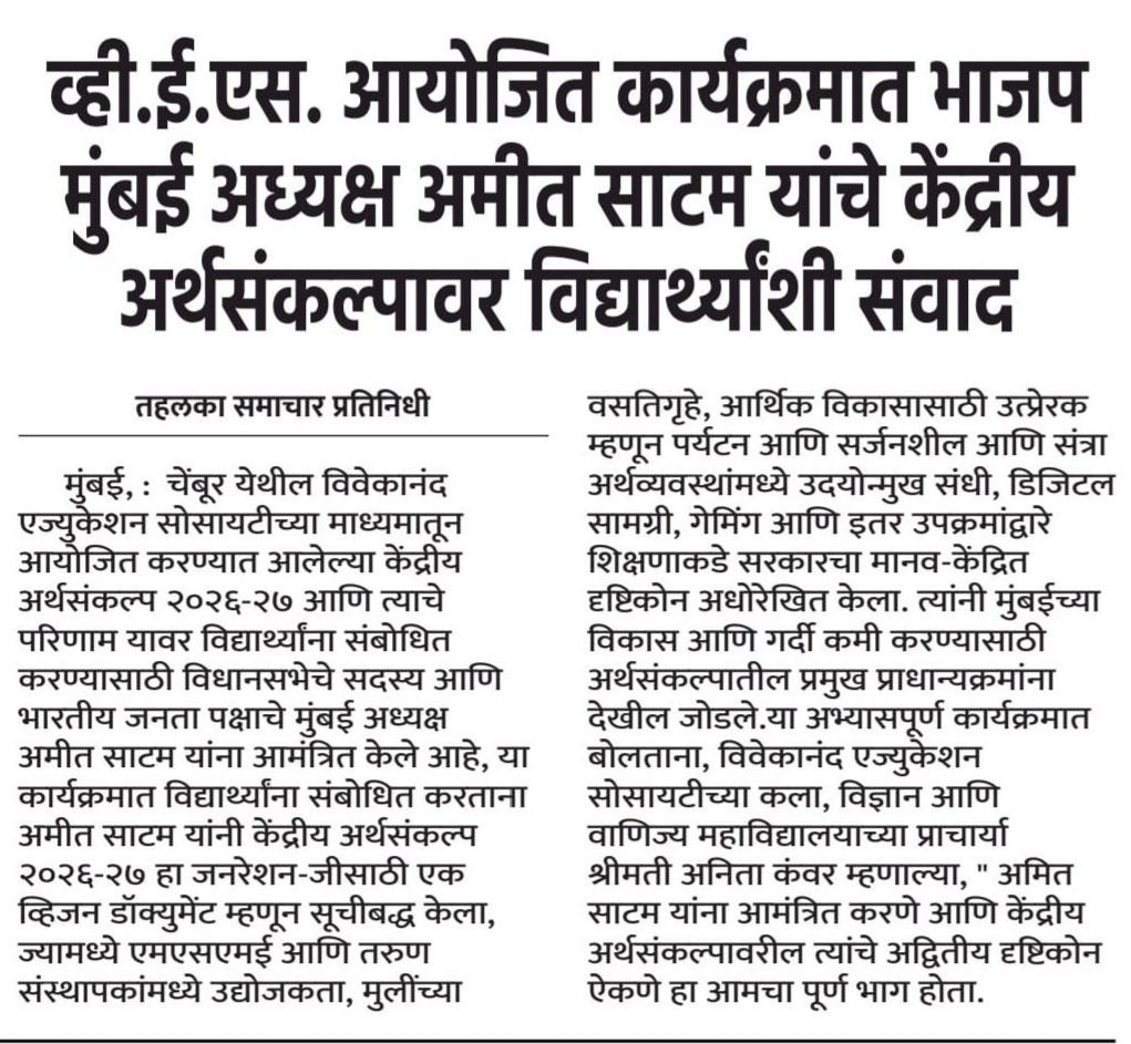 व्ही.ई.एस. आयोजित कार्यक्रमात भाजप मुंबई अध्यक्ष अमित साटम यांचे केंद्रीय अर्थसंकल्पावर विद्यार्थ्यांशी संवाद